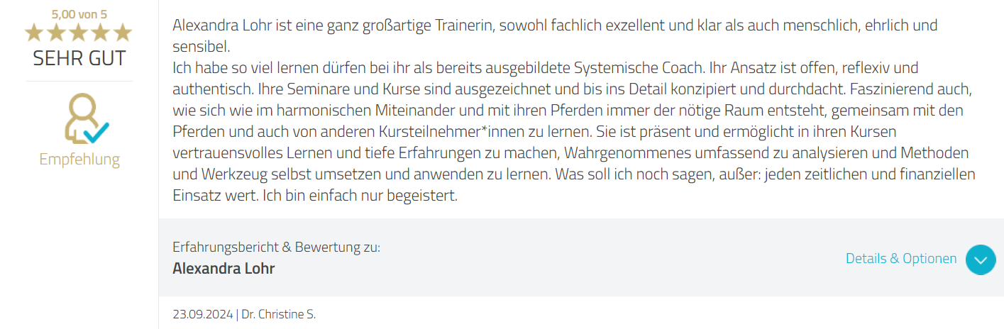Alexandras nahbare und einfühlsame Art überzeugte sie ebenso wie die Methode, die die Pferde nicht nur respektiert, sondern ihnen Raum gibt, frei mitzuwirken.